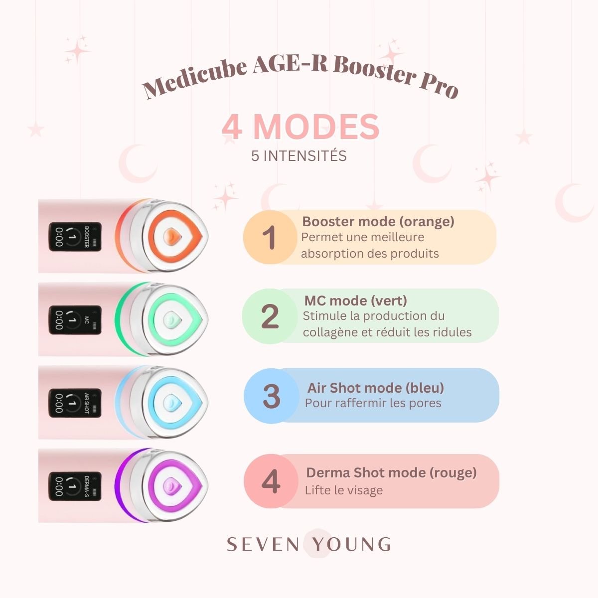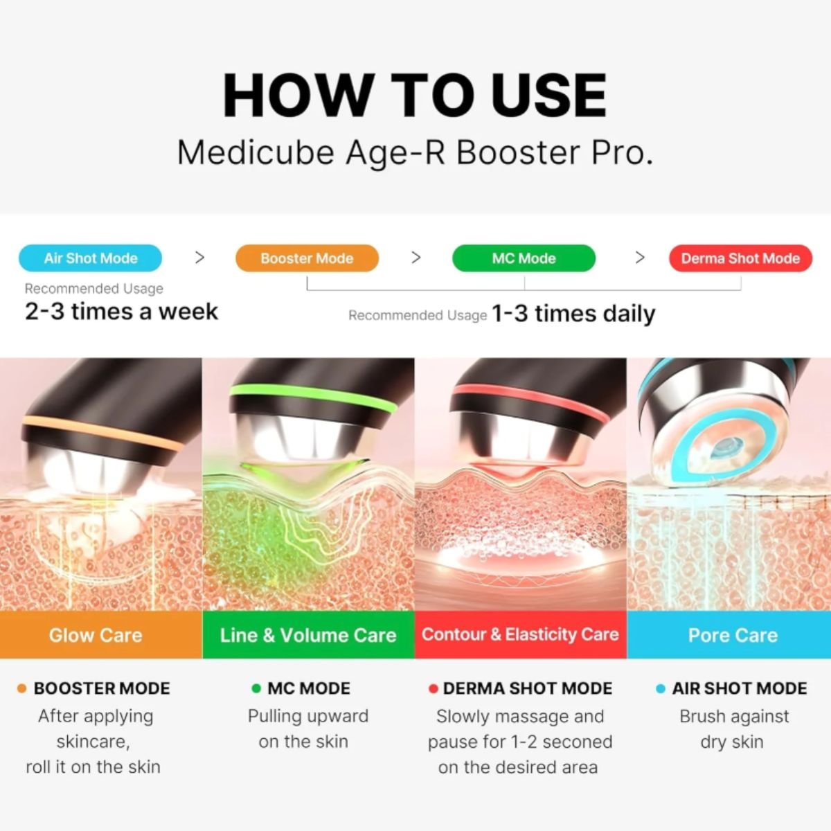 Each mode is complemented by customizable sonic vibrations and different colored LED lights to make it easy to switch between functions. The device can also be connected via Bluetooth to the AGE-R Booster Pro mobile app for remote control and other features.