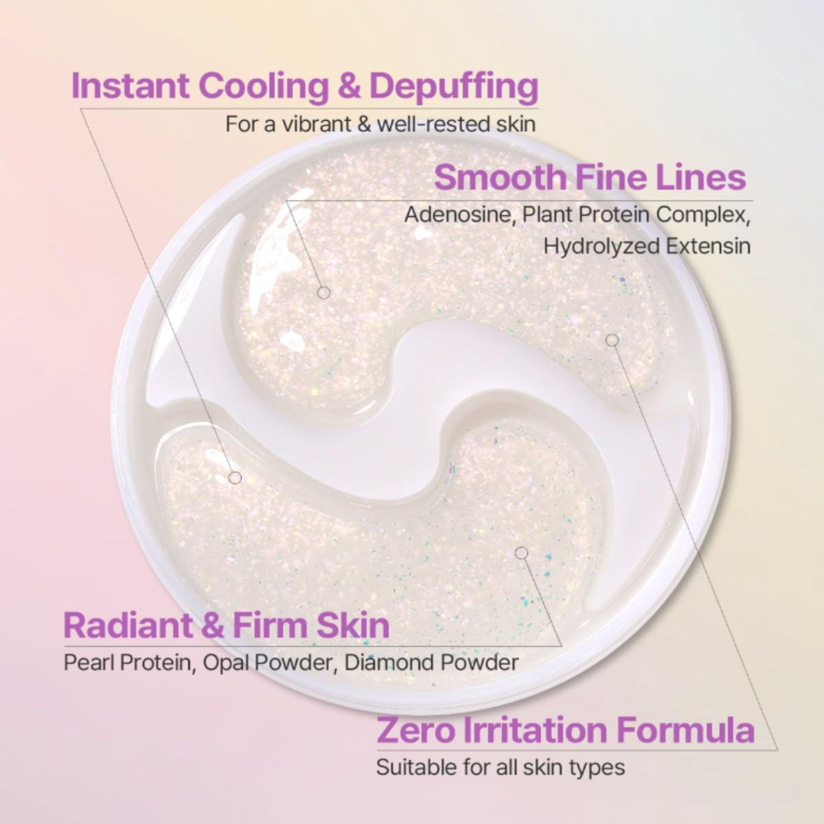 Water, Glycerin, Dipropylene Glycol, Niacinamide, 1,2-Hexanediol, Ceratonia Siliqua (Carob) Gum, Chondrus Crispus Powder, Chondrus Crispus Extract Panthenol, Cellulose Gum, Butylene Glycol, Paeonia Suffruticosa Root Extract, Centella Asiatica Extract, Sodium Polyacrylate, Potassium Chloride, Algin, Hydrogenated Polydecene, Chamomilla Recutita (Matricaria) Flower Extract, Glyceryl Caprylate/Caprate, Allantoin, Xanthan Gum, Polysorbate 20., Sucrose, Adenosine, Ethylhexylglycerin, Silica, Trideceth-6, Dextrin, Pantolactone, Titanium Dioxide[10ml Hydrolyzed Extensin,Pearl PowderDiamond Powder Hydrolyzed Conchiolin Protein, Glycine Soja (Soybean) Protein, Hydrolyzed Lupine Protein, Hydrolyzed Sweet Almond Protein, Hydrolyzed Vegetable Protein, Hydrolyzed Rice Protein, Hydrolyzed Corn Protein, Hydrolyzed Soy Protein, Disodium EDTA, Fragrance