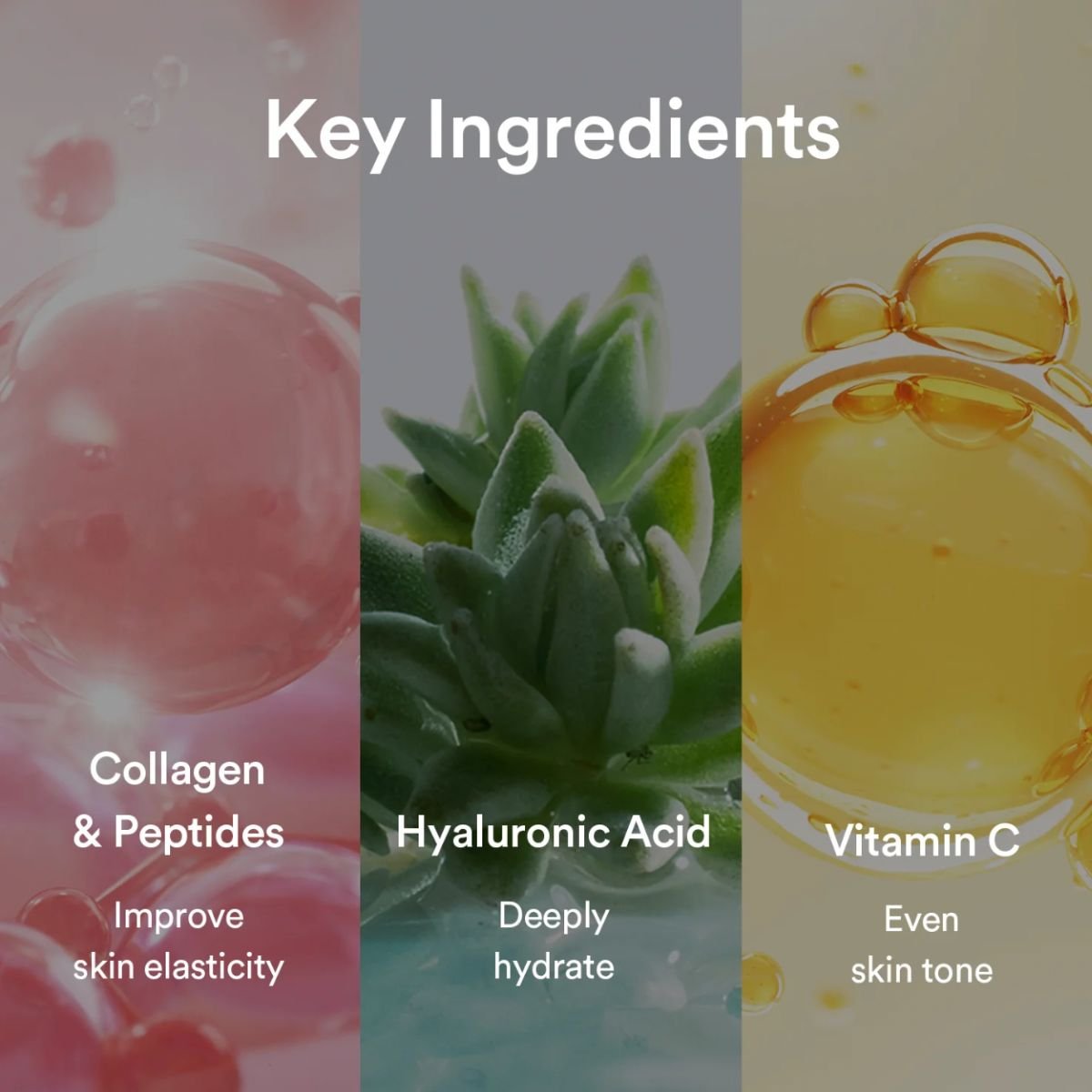 Infused with 100,005 ppm of fermented collagen, skin-boosting palmitoyl tripeptide-5, and hyaluronic acid, it helps you achieve glowing, hydrated skin.