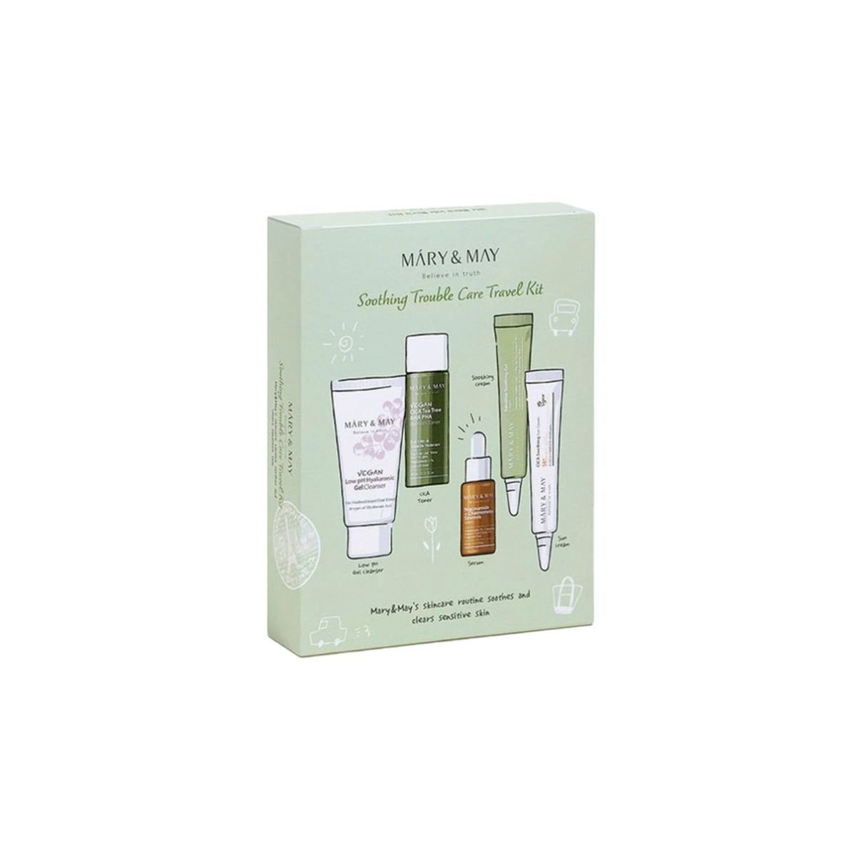 The Mary&May Soothing Trouble Care Travel Kit contains 5 mini products that help moisturize and calm skin. Perfect for traveling, giving as a gift, or discovering Mary&May products.