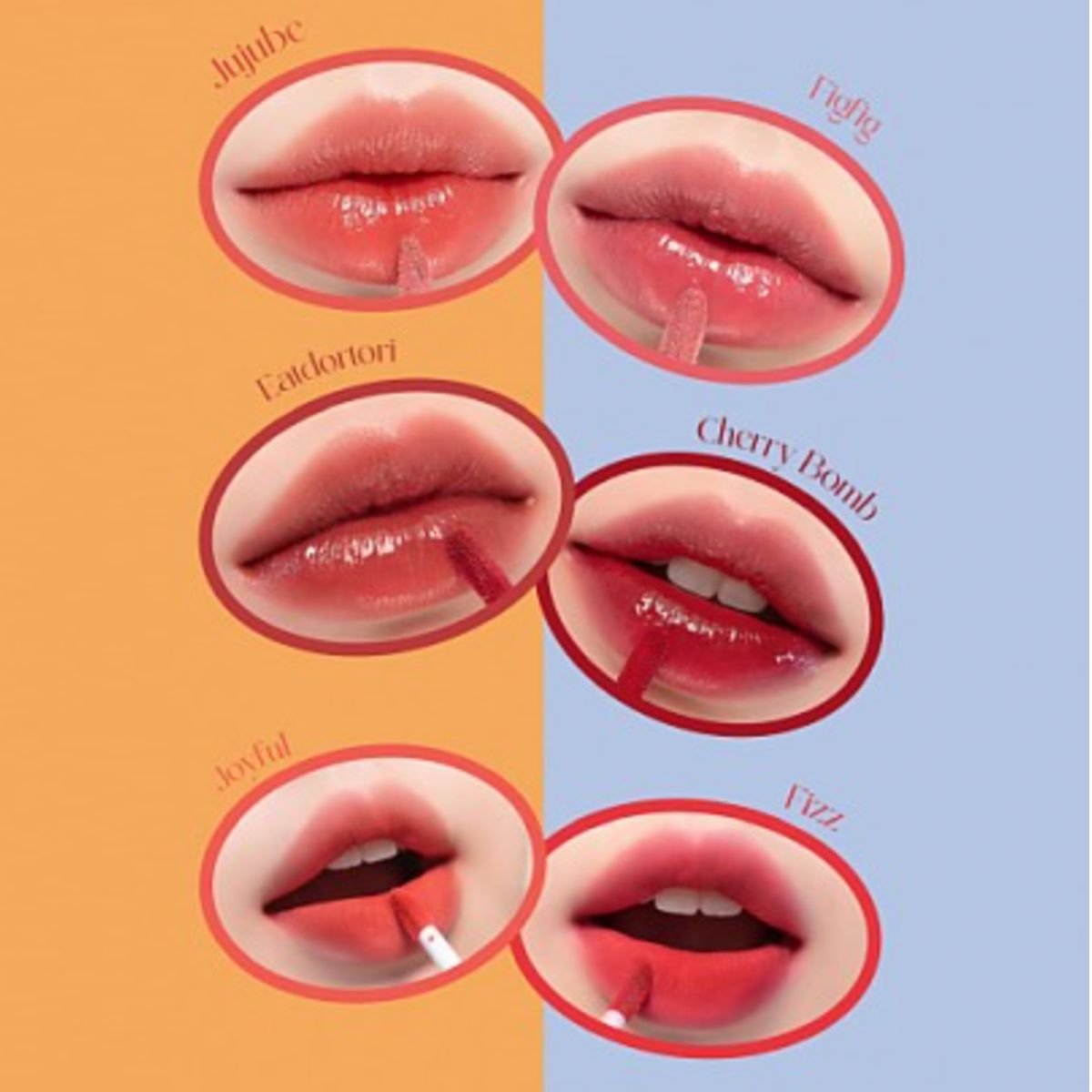Dimethicone Crosspolymer, Polyglyceryl-2 Triisostearate, Diisostearyl Malate, Tribehenin, Tartrazine (CI 19140), Red Oxide of Iron (CI 77491), Titanium Dioxide (CI 77891), Macadamia Integrifolia Seed Oil, Olive Oil, Jojoba Seed Oil, Grape Seed Oil, Gossypium Herbaceum (Cotton) Seed Extract, Cetyl PEG/PPG-10/1 Dimethicone, VP/Hexadecene Copolymer, Polyglyceryl-2 Diisostearate, Butyl Acrylate/Hydroxypropyl Dimethicone Acrylate Copolymer, Isododecane, Isobutyl Methacrylate/Bis-Hydroxypropyl Dimethicone Acrylate Copolymer, Purified Water, Glycerin, Butylene Glycol, Sucrose Palmitate, Hydrogenated Lecithin, Dehydroacetic Acid, Fragrance, Lithol Rubine BCA (CI 15850:1), Octyldodecanol, Dimethicone, Denatured Alcohol, Acrylates Copolymer, Sorbitan Stearate, Ethylcellulose, Behenyl Alcohol, Pentylene Glycol, Actinidia Chinensis (Kiwi) Fruit Extract, Carica Papaya (Papaya) Fruit Extract, Citrus Paradisi (Grapefruit) Fruit Extract, Cocos Nucifera (Coconut) Fruit Extract, Mangifera Indica (Mango) Fruit Extract, Psidium Guajava Fruit Extract, Polysorbate 60, Silica, Sodium Acrylate/Sodium Acryloyldimethyl Taurate Copolymer, Isohexadecane, Polysorbate 80, Ethylhexylglycerin, Disodium EDTA, Phenoxyethanol, Iron Oxide Yellow (CI 77492), Fast Acid Magenta (CI 17200), Black Oxide of Iron (CI 77499), Sunset Yellow FCF (CI 15985), Ethyl Cellulose, Polyglyceryl-2Diisostearate, Sorbitan Oleate, Brilliant Blue FCF (CI 42090), [Juicy Lasting Tint - Fig Fig]: Purified Water, Benzyl Alcohol Linalool Phloxine B (CI 45410), Brilliant Blue FCF (CI 42090) [Zero Velvet Tint - Fizz]: Dimethicone, Brilliant Blue FCF (CI 42090) [Juicy Lasting Tint - #13 Eat Dotori]: Purified Water, Linalool, [Zero Velvet Tint - #02 Joyful]: Dimethicone, Benzyl Alcohol, Iron Oxide Yellow (CI 77492) [Juicy Lasting Tint - #07 Jujube]: Purified Water, Polyglyceryl-2 Diisostearate Sorbitan Oleate, Phloxine B (CI 45410), New Coccine (CI 16255), Brilliant Blue FCF (CI 42090) [Juicy Lasting Tint - Cherry Bomb]: Purified Water, Benzyl Alcohol Linalool Titanium Dioxide (CI 77891)