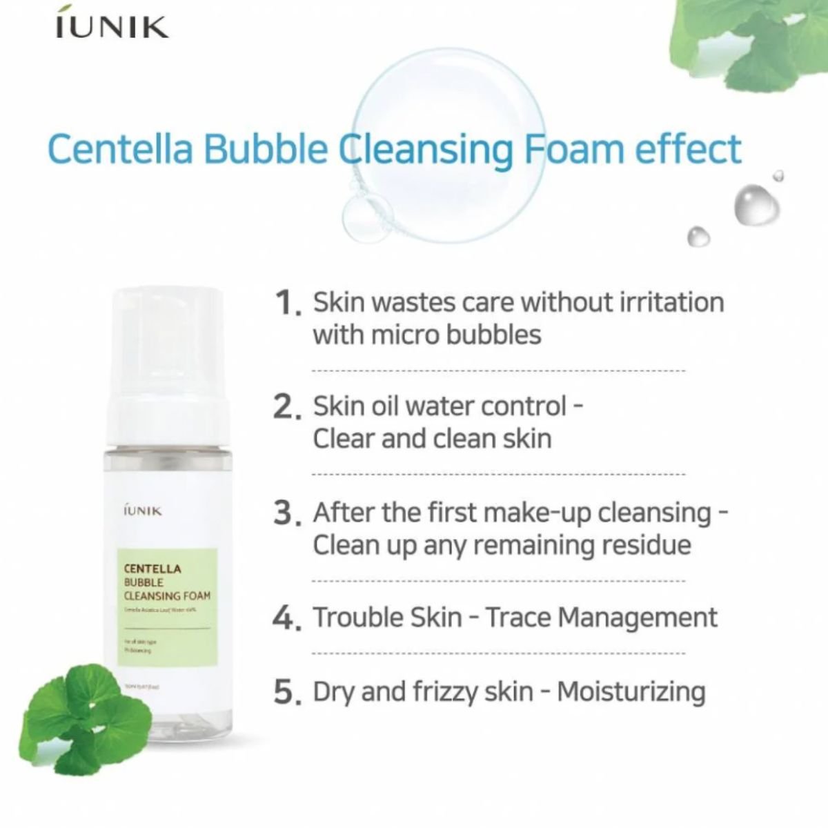Centella Bubble Cleansing Foam iUNIK est un nettoyant doux au pH équilibré qui élimine les impuretés et les résidus de maquillage tout en hydratant la peau.