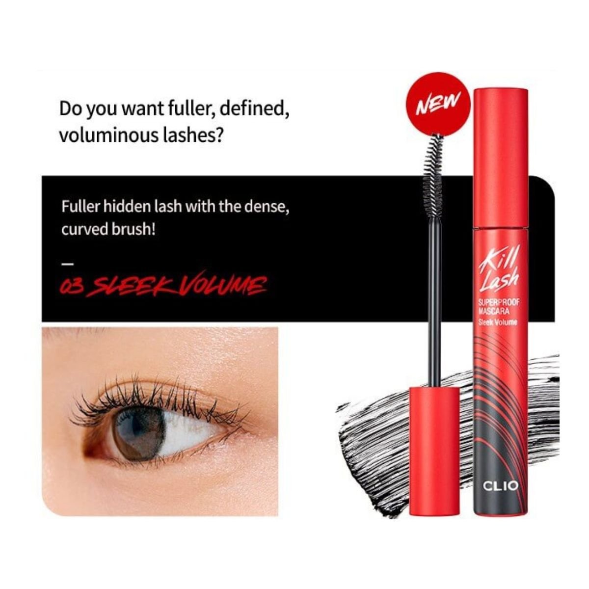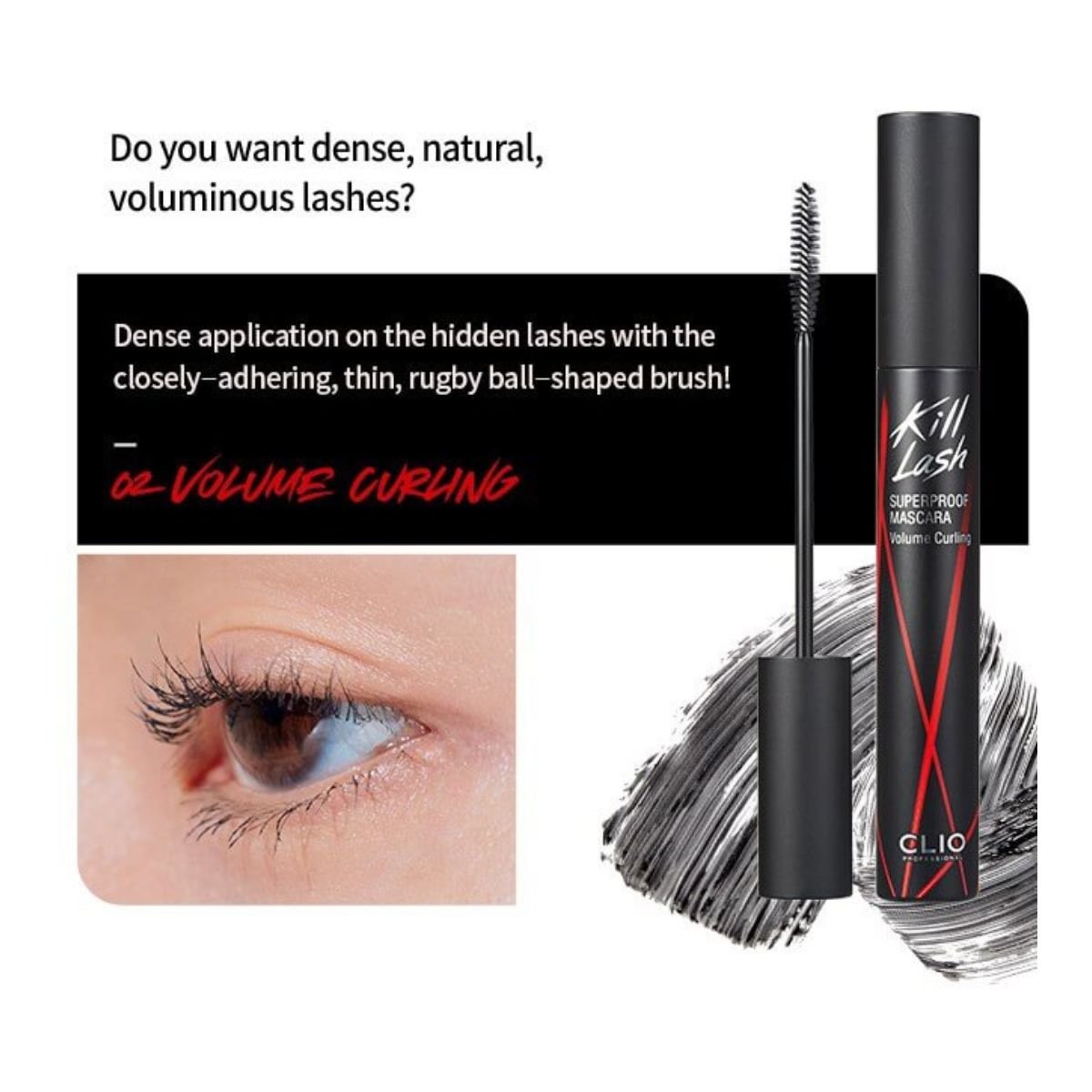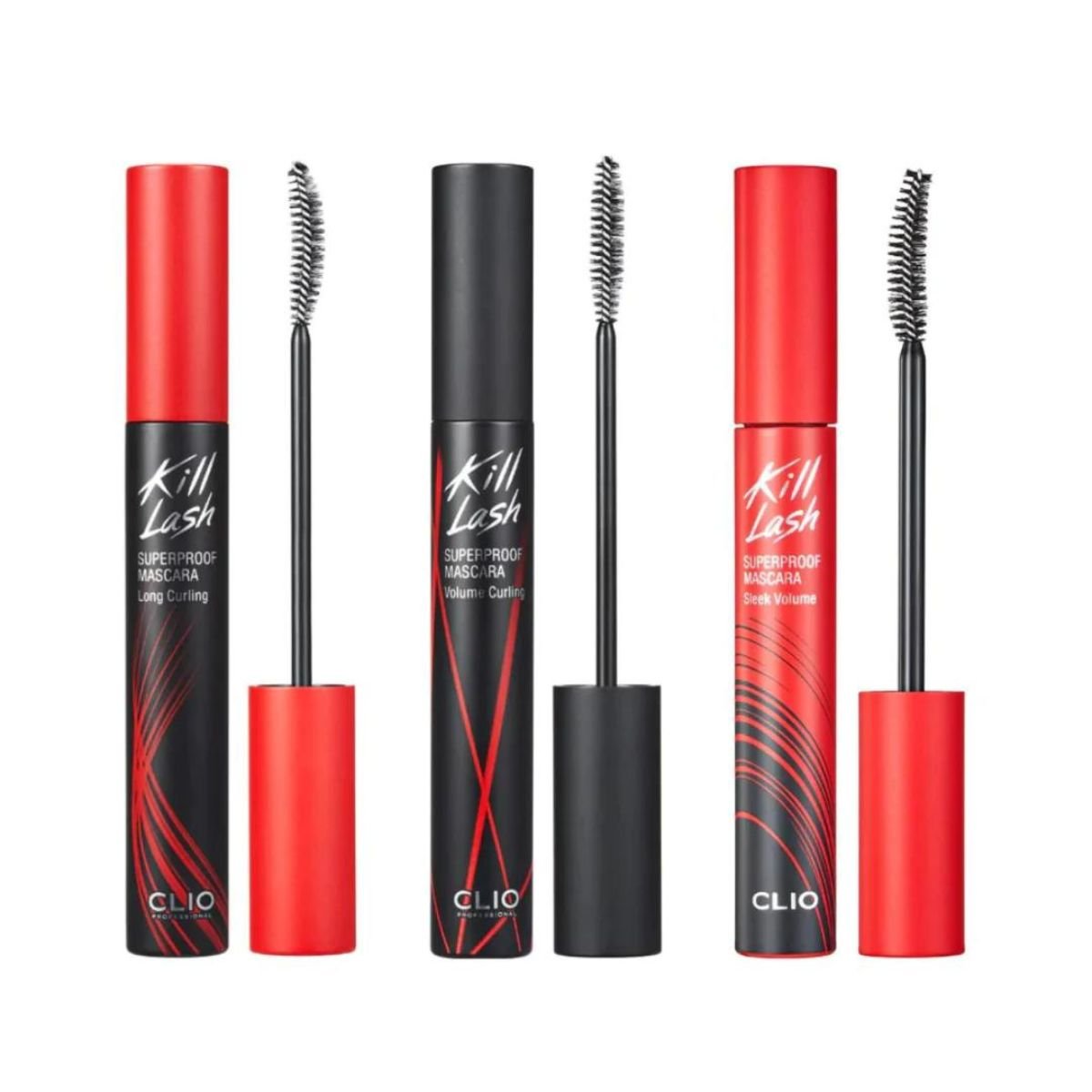Les mascaras Kill Lash Superproof de chez CLIO vont vous donner des cils allongés et courbés en un rien de temps. Sa formule longue tenue de type cire apporte de la définition à votre regard sans paquets.
