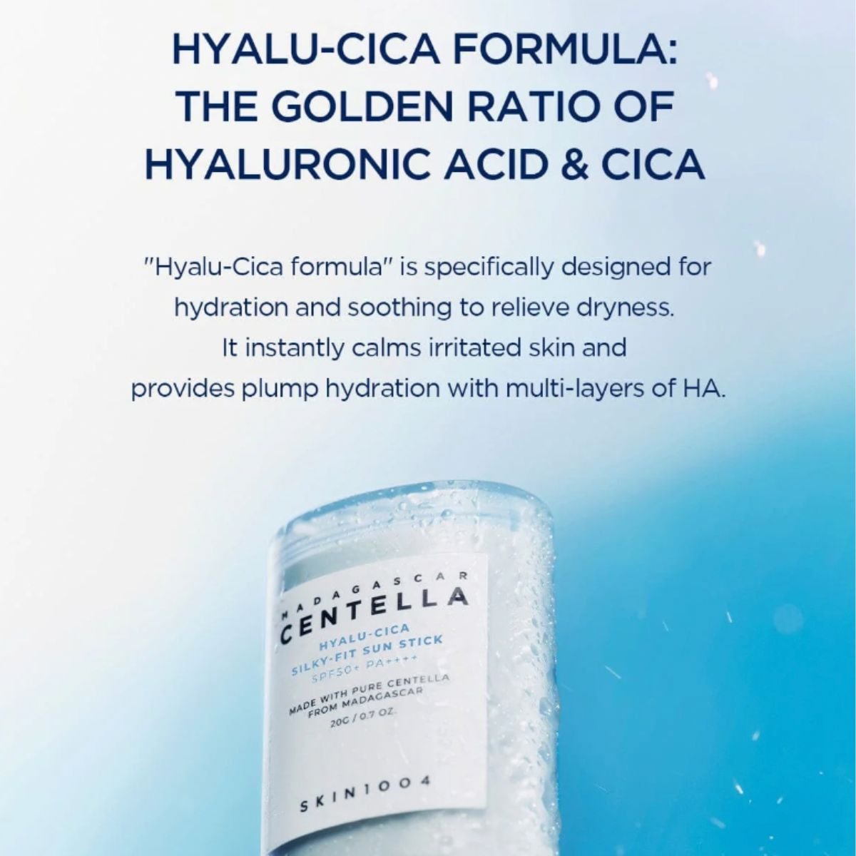 SKIN1004 Madagascar Centella Hyalu-Cica Silky-Fit Sun Stick est un stick solaire SPF50+ PA++++ conçu pour protéger la peau des rayons UV tout en la maintenant hydratée.