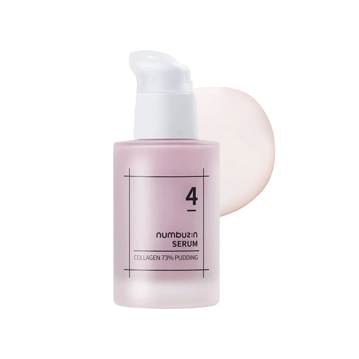 No.4 Collagen 73% Pudding Serum de Numbuzin est formulé avec 73% de collagène, d'acides hyaluroniques, de l'adénosine et de l'élastine hydrolysée pour combattre la sécheresse, réduire les signes de l'âge et redonner de l'élasticité à la peau.