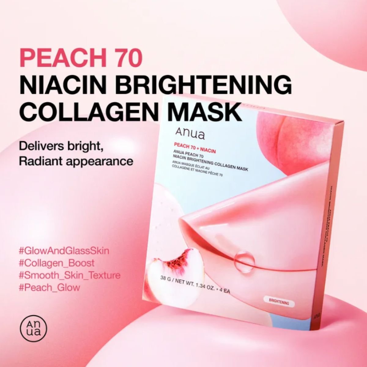 Peach 70 Niacin Brightening Collagen Mask est infusé d'eau de pêche et de collagène à faible poids moléculaire (300Da) pour une peau plus ferme et hydratée.