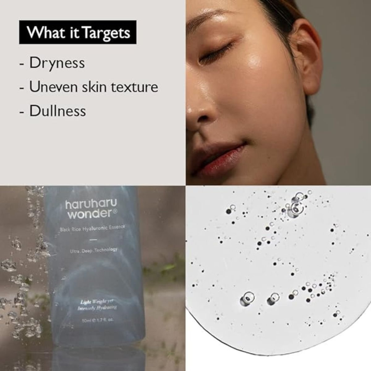 Haruharu Wonder Black Rice Hyaluronic Essence est formulée à base de 10 000 ppm d’extrait de riz noir fermenté pour lutter contre les signes de l’âge.